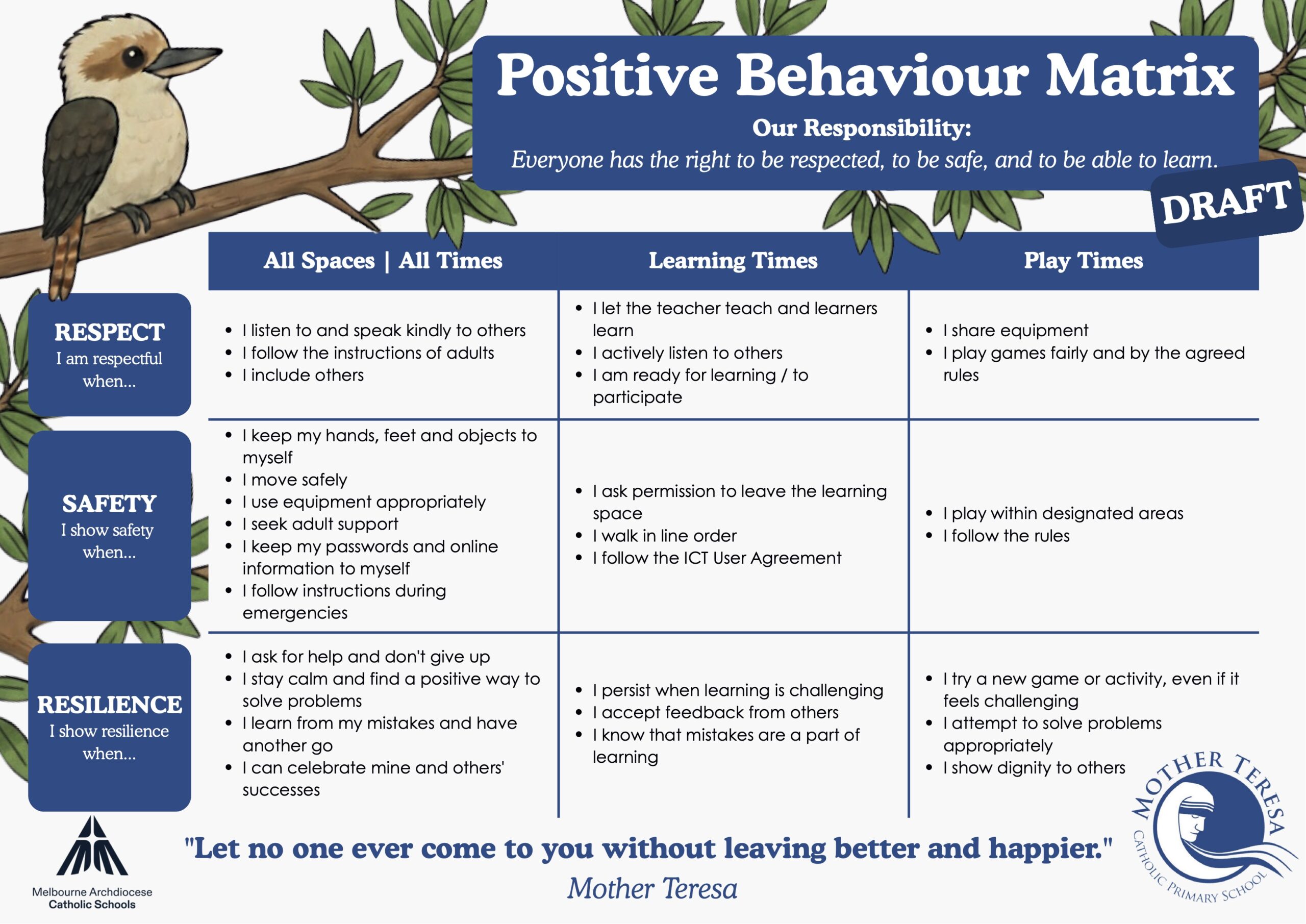 At Mother Teresa, our Positive Behaviour Matrix serves as a guide that clearly outlines the expected behaviours for students across all areas of school life. It defines what Respect, Safety, and Resilience look like in different settings, during both learning and play. The School Values that underpin the Matrix, were identified and selected by our school community, including students, staff and our families.The Matrix helps everyone understand how to contribute to a positive and supportive school environment. It encourages students to make good choices, promotes consistency in behaviour expectations across the school, and fosters a culture of kindness, cooperation, and responsibility. Teachers use the Matrix to recognise and reinforce positive behaviours, ensuring every student feels valued, respected, and supported.